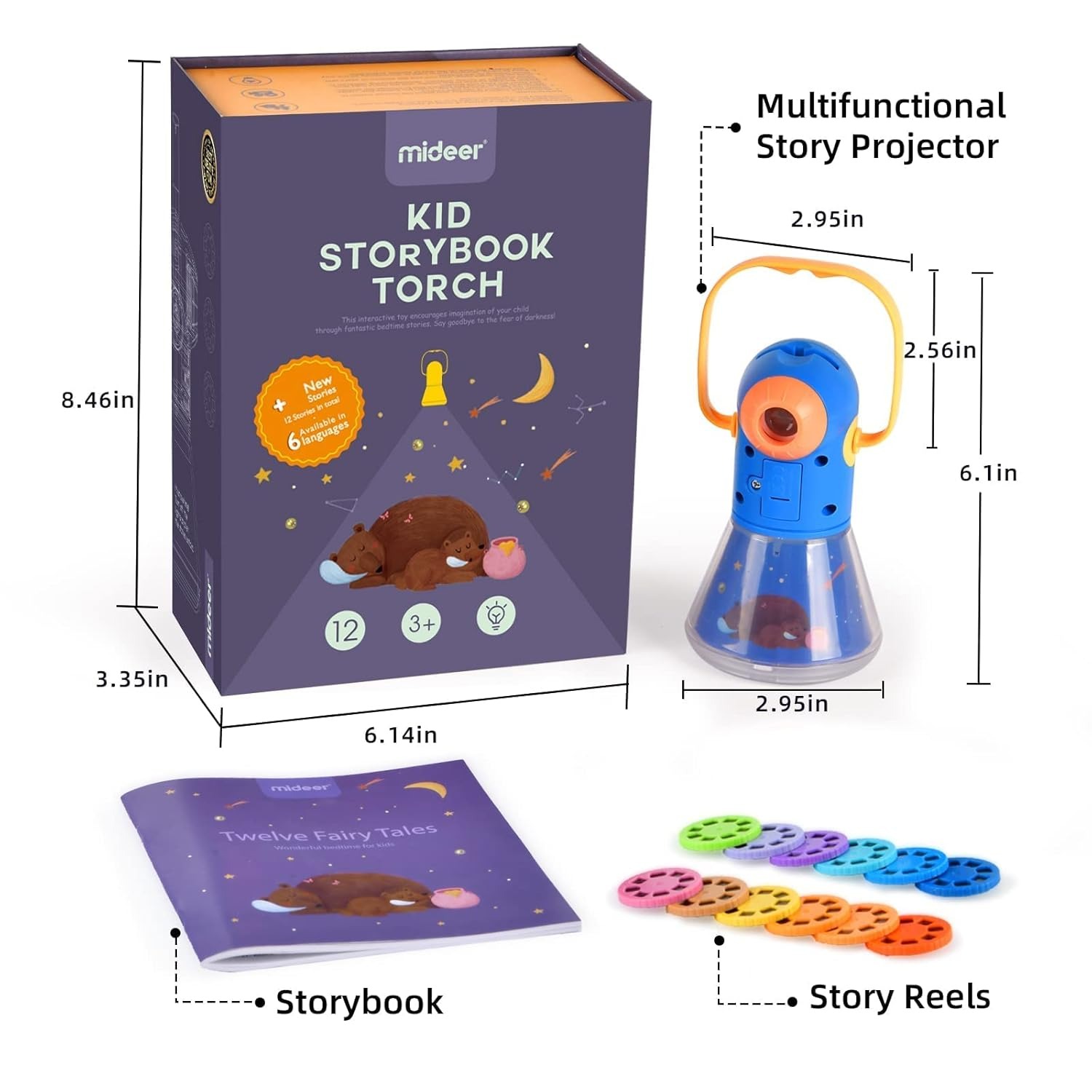 Chỉ cần đặt cuộn phim có câu chuyện mà bé thích vào rãnh trên cây đèn pin sau đó bật đèn chiếu trên một mặt phẳng là các mẹ có thể bắt đầu kể cho bé nghe rồi. Sau mỗi hoạt cảnh chỉ cần xoay bên trái để tiếp tục và cứ như thế cho hết câu chuyện.