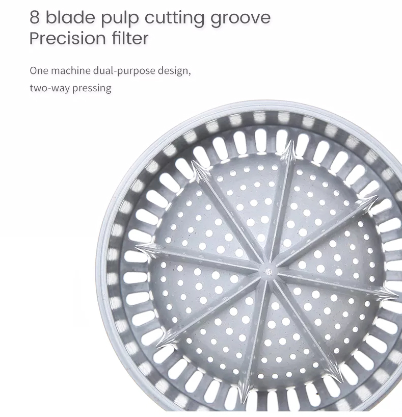 - Lưới lọc với 8 khe giúp việc vắt được ma sát nhiều hơn tăng thời gian vắt hơn. Phía nắp chụm gồm 12 ngạnh giúp ôm vỏ trái cây nên việc xoay và ép dễ dàng vắt nhanh hơn.