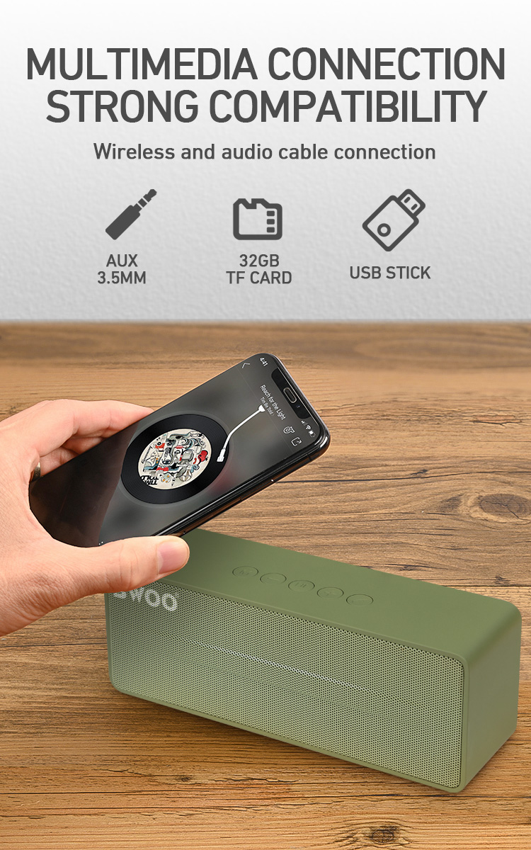 Sản phẩm có thể kết nối trực tiếp với thiết bị qua cáp âm thanh AUX 3.5mm, hoặc thẻ nhớ TF, USB để phát các file âm thanh.