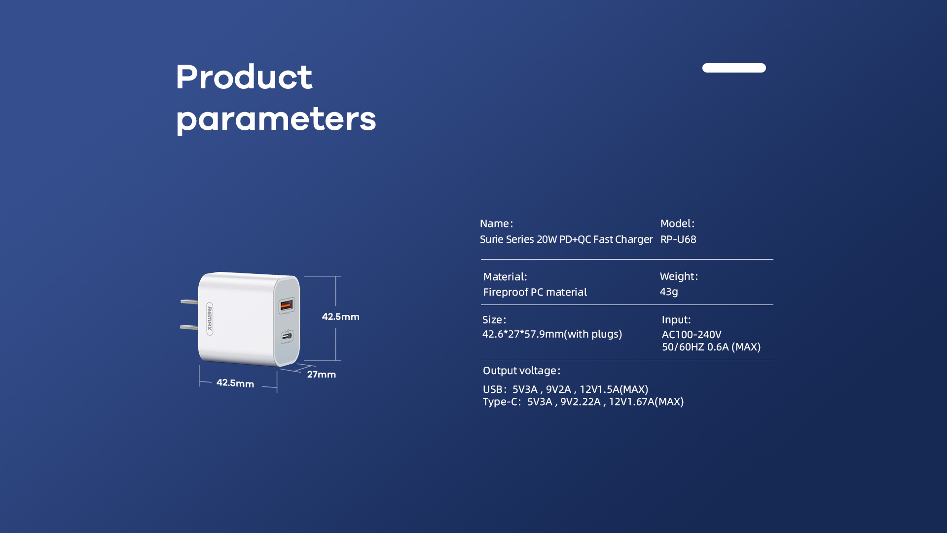 Material and Technology: ABS Nguồn vào: AC100-240V 50-60HZ 0.6A(MAX) Nguồn ra: - USB-A: DC 5V-3A; 9V-2A; 12V-1,5A - Type-C: DC 5V-3A; 9V-2,22A; 12V-1,5A