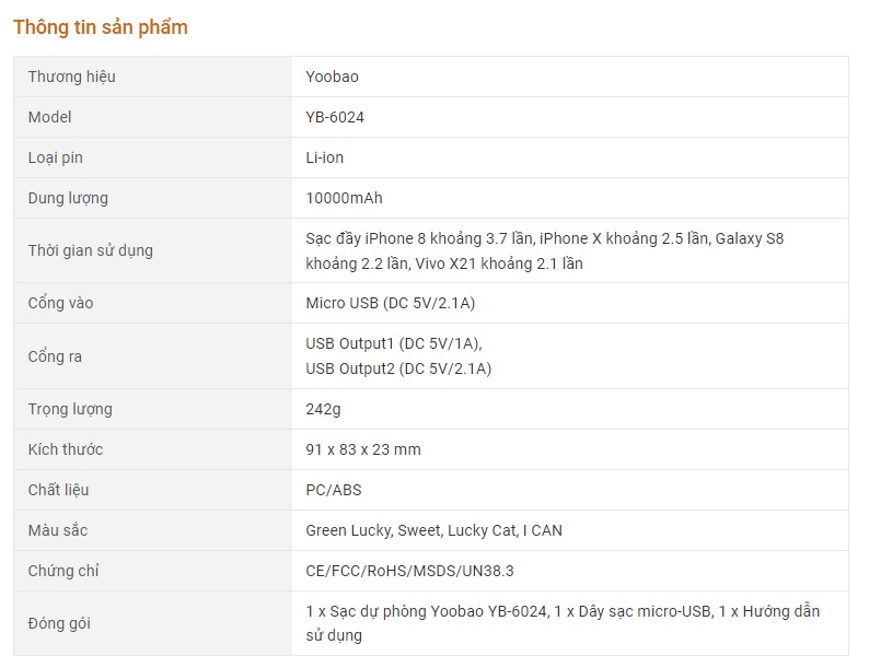 Sạc dự phòng Yoobao sạc nhanh 6024mini Q