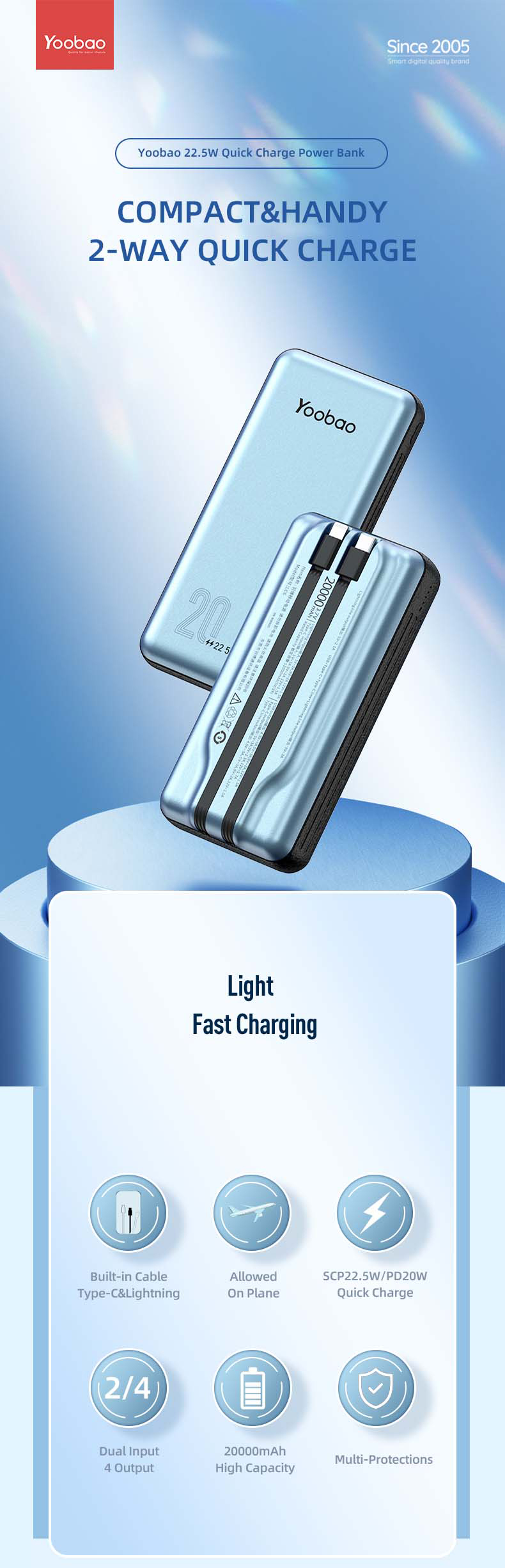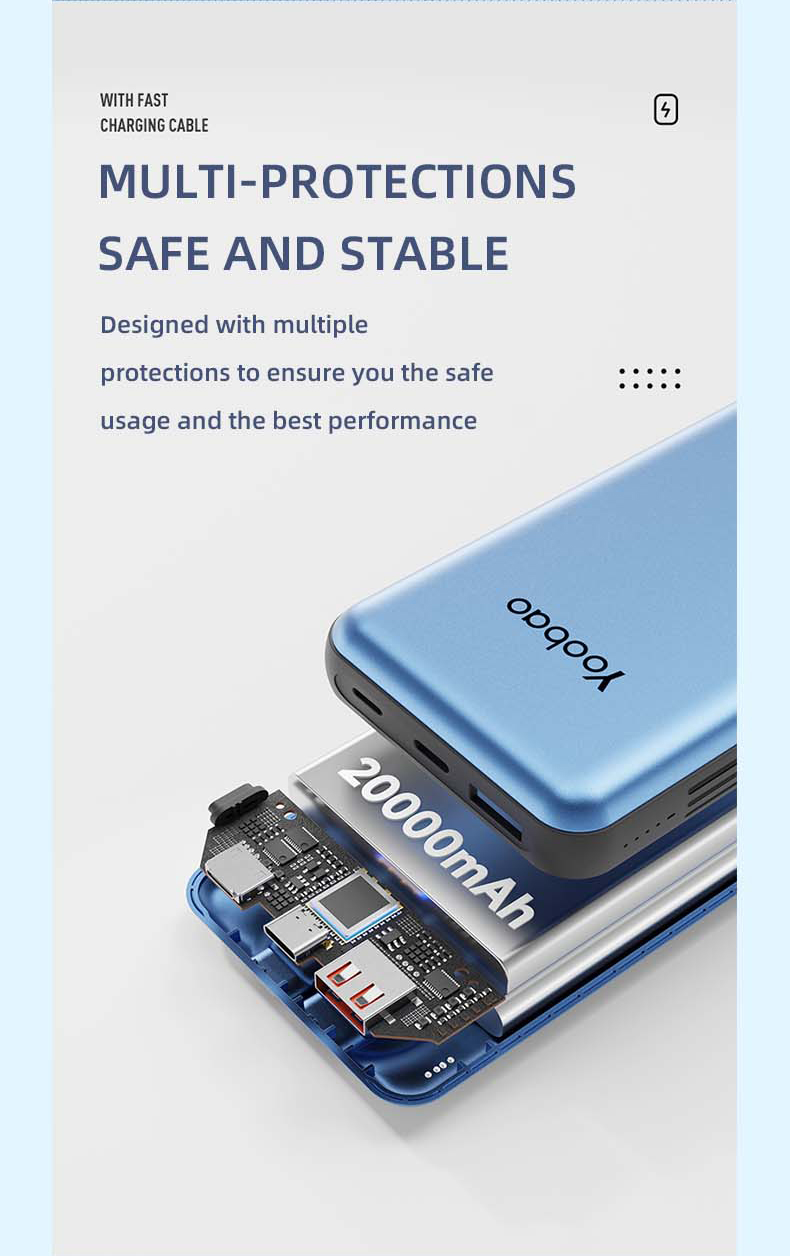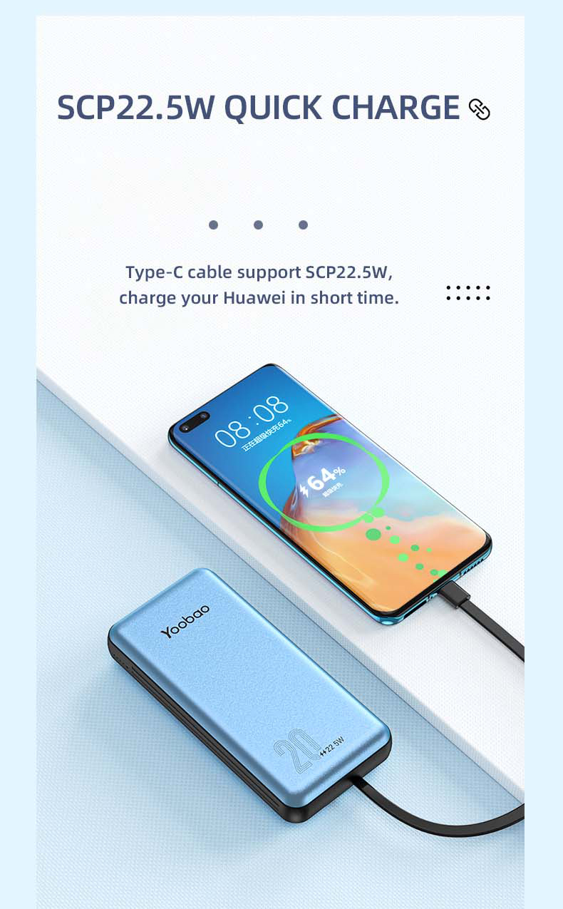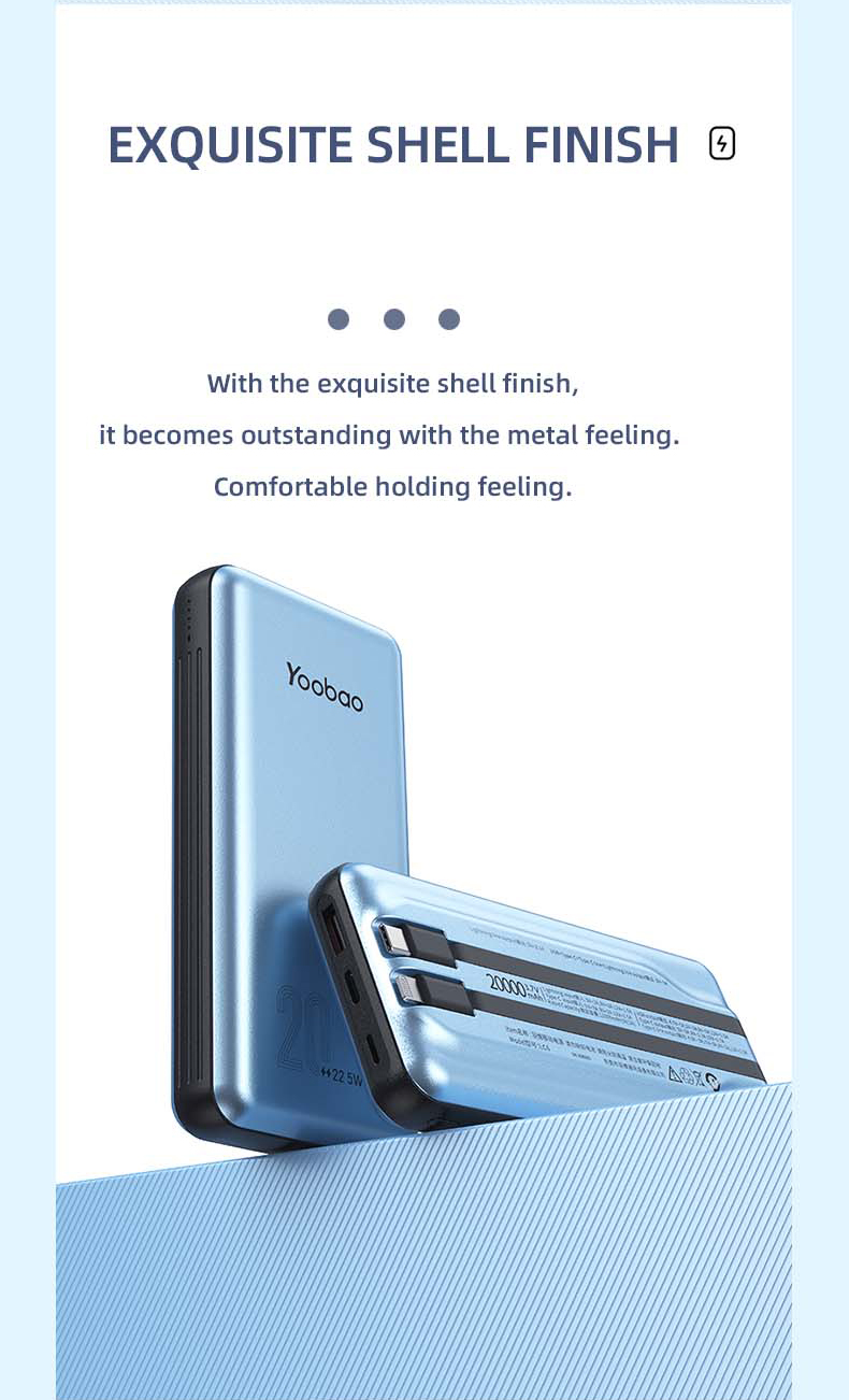Sạc dự phòng Yoobao sạc nhanh LC6 Built-in Cable PD3.0/QC3.0/SCP22.5W Quick Charge Power Bank 20000mAh, Type-C and Lightning Cable, Exquisite Shell Finish