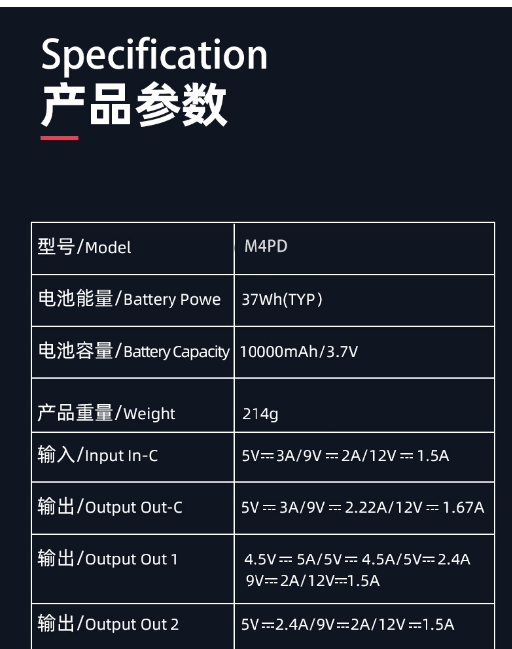 - DC 4.5V=5A/5V=4.5A/5V=2.4A/9V=2A/12V=1.5A (Cổng USB)