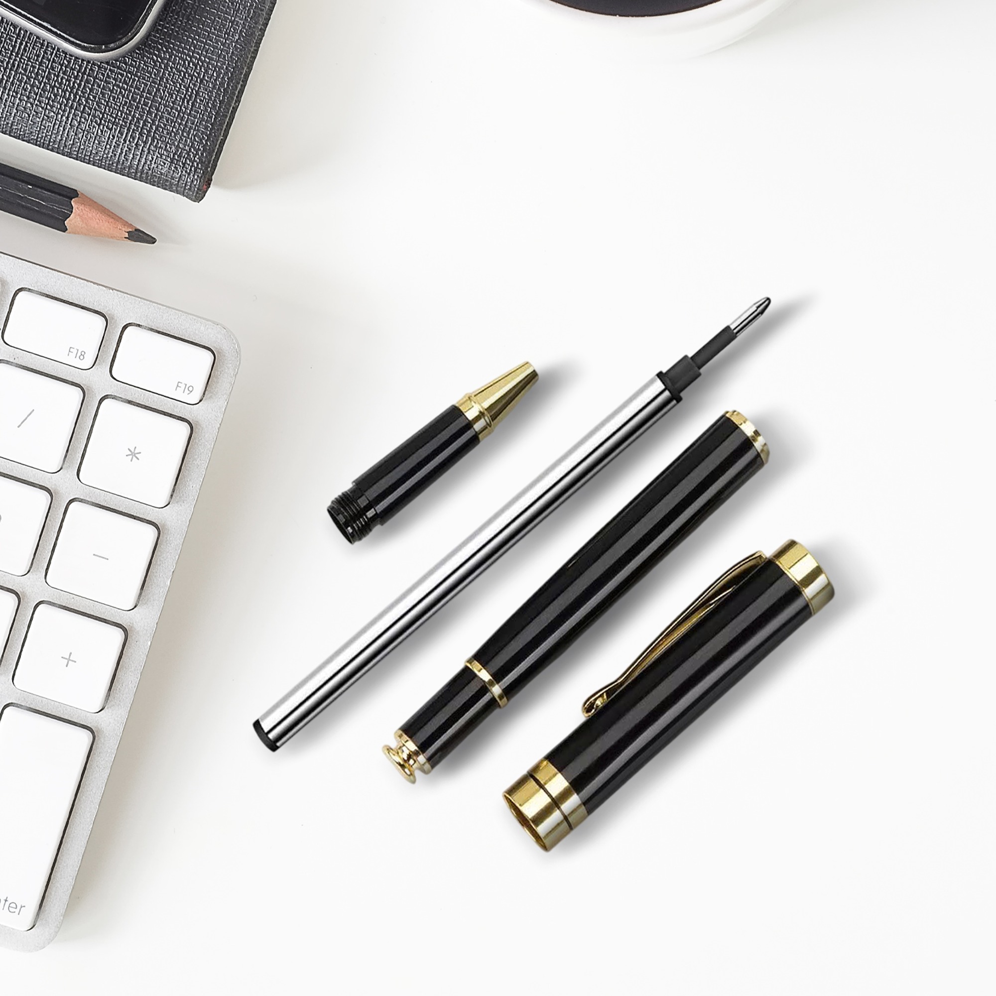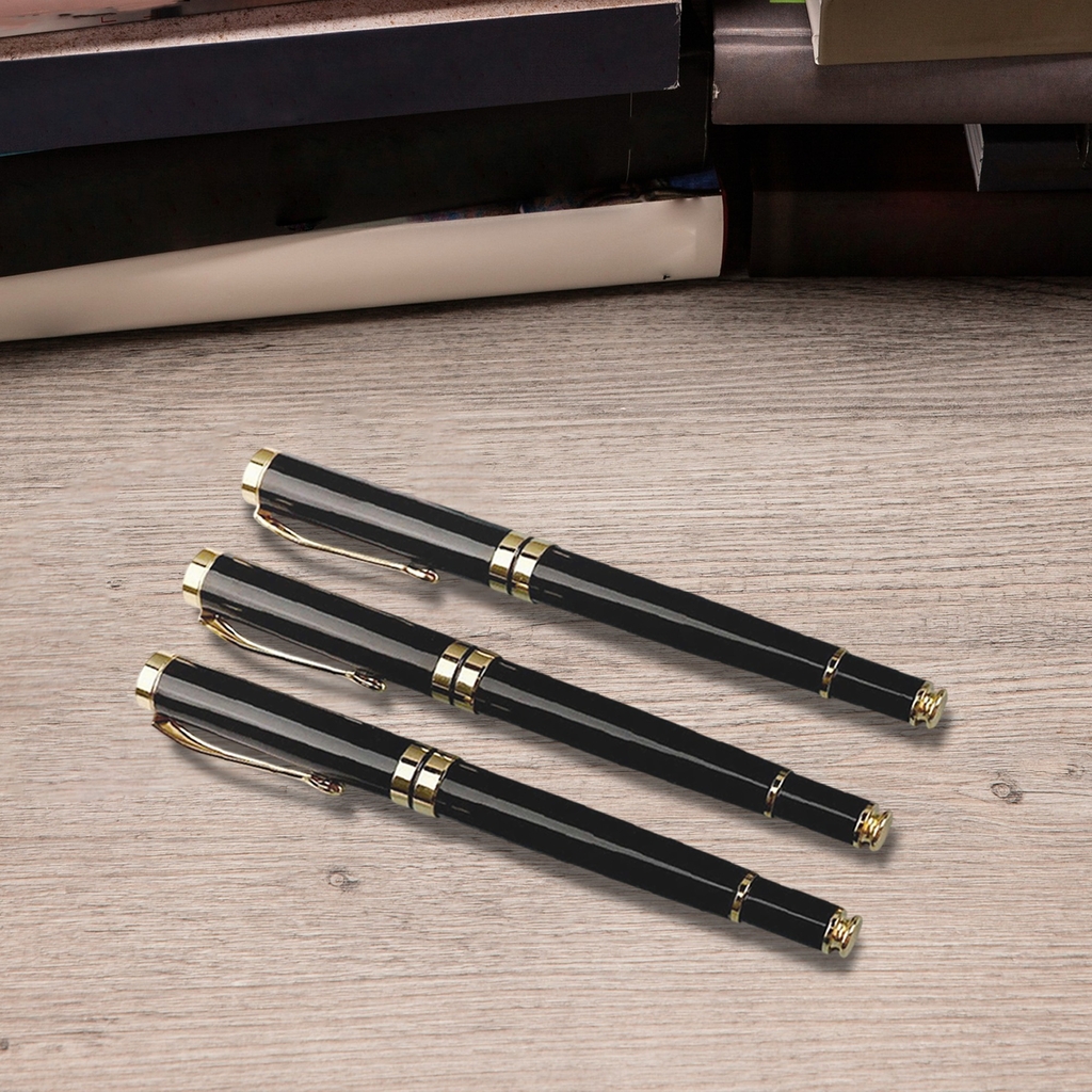• Chất Liệu: Hợp kim cao cấp • Màu Sắc: Đen viền vàng • Kích thước: 14cmx1.2cm (cao x rộng) • Loại bút: Bút dạ bi (Rollerball) • Mực: Ngòi 0,5mm. Mực xanh và đen